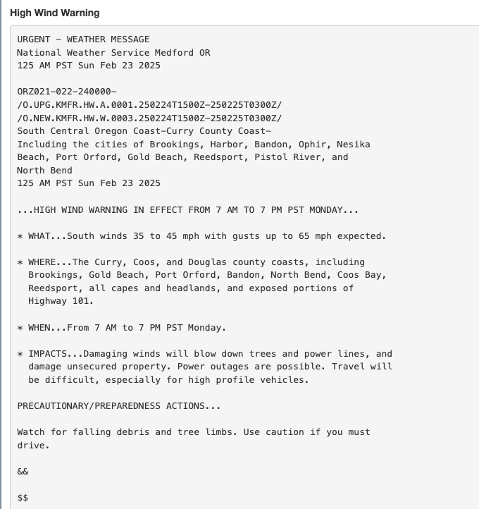 NWS – URGENT – Winds & Flooding Posted byCCRC EditorFebruary 23, 2025June 7, 2025Posted inUncategorized URGENT - WEATHER MESSAGE National Weather Service Medford OR 125 AM PST Sun Feb 23 2025 Links below... High Wind Warning in effect from February 24, 07:00 AM PST until February 24, 07:00 PM PST High Surf Warning in effect from February 24, 10:00 AM PST until February 25, 10:00 AM PST Flood Watch until February 24, 10:00 AM PST Share this: Share on X (Opens in new window) X Share on Facebook (Opens in new window) Facebook Like Loading... Related