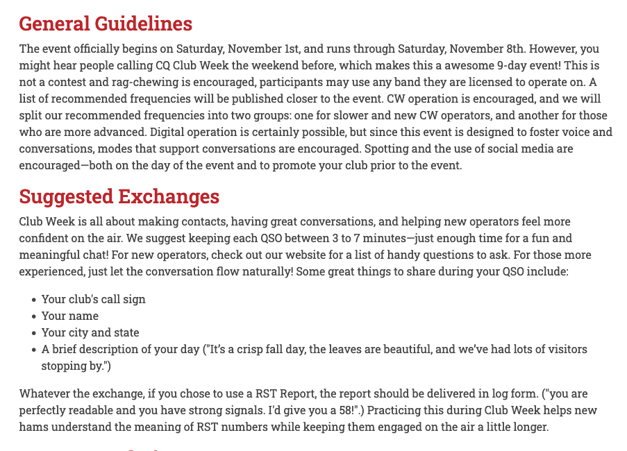 Club Week is a multipurpose, week-long event. While the primary goal is to contact other clubs and exchange QSL cards, this uniquely designed on-the-air event serves many additional purposes.