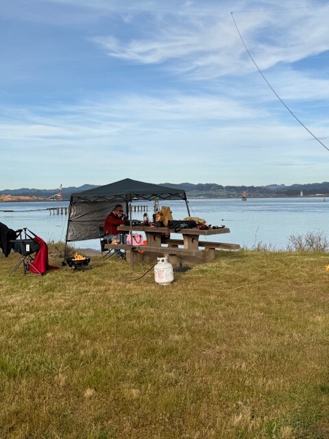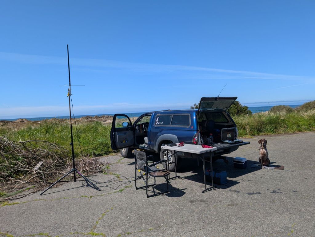 K7FC: I started the club activation out at Tugman State Park north of Lakeside in Coos County. I set up an end-fed half wave antenna with a telescopic mast and my Icom 705. Conditions were tough, I spent my time on the 20 meter band and it took about an hour to make 10 contacts. I then packed up and headed south and joined John KK6GUK at the North Spit BLM boat ramp. John had quite the set up with a pop-up tent and a large delta loop antenna that proved to be much better than my end-fed half wave antenna based on the location, surrounded by saltwater, and the gain of the delta loop. We were joined by Al KK7CLH, Tina (don’t know Tina’s callsign), and Vic K7YMM. We were able to hear Gary activating Bullard’s Beach State Park on 20m SSB, but he could not hear us when we tried to call him. I was able to make 10 more QSOs at the BLM site, and John made almost 80 by the end of the day.