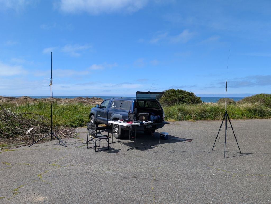 N6BLU: The absolute toughest conditions were had at the beginning of the clubs POTA today. Never has it taken so long to get that first contact….almost two hours. When it was all said and done it did pickup but then slowed again. I gave it about 4 and half hours but managed 48 contacts with 26 park to parks from US 2816(Bullards Beach SP) and US 10007(Oregon Coast Trail). Used my EFHW and my JPC-12 Vertical on 20 and 40 meters.